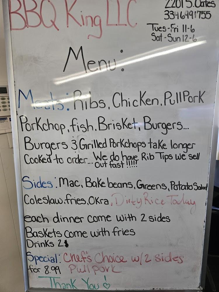 Welcome to Barbecue King LLC, your premier destination for mouthwatering barbecue in the Wiregrass Area. Located at 2201 S Oates St, Dothan, AL, we pride ourselves on serving slow-smoked meats prepared in our on-site smokers, filled with hickory wood for that authentic flavor. Enjoy a cozy dining experience with accessible seating, or take advantage of our takeout, drive-thru, and delivery options. Whether you're stopping by for lunch or dinner, our friendly staff is committed to providing fast service and hearty portions at an affordable price. Come savor our local specialties and elevate your BBQ experience today!